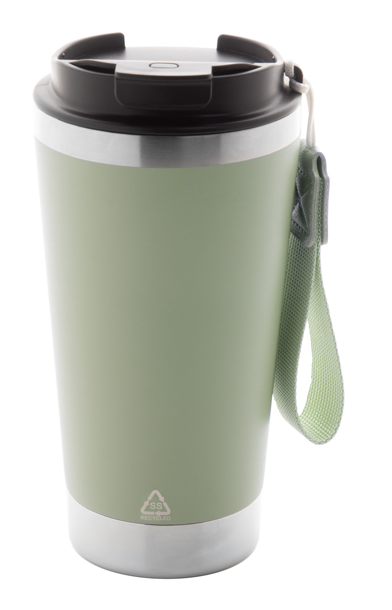 DetailDvoustěnný termo hrnek z recyklované nerezové oceli s víčkem na pití z PP a páskem na přenášení v odpovídající barvě. 430 ml.